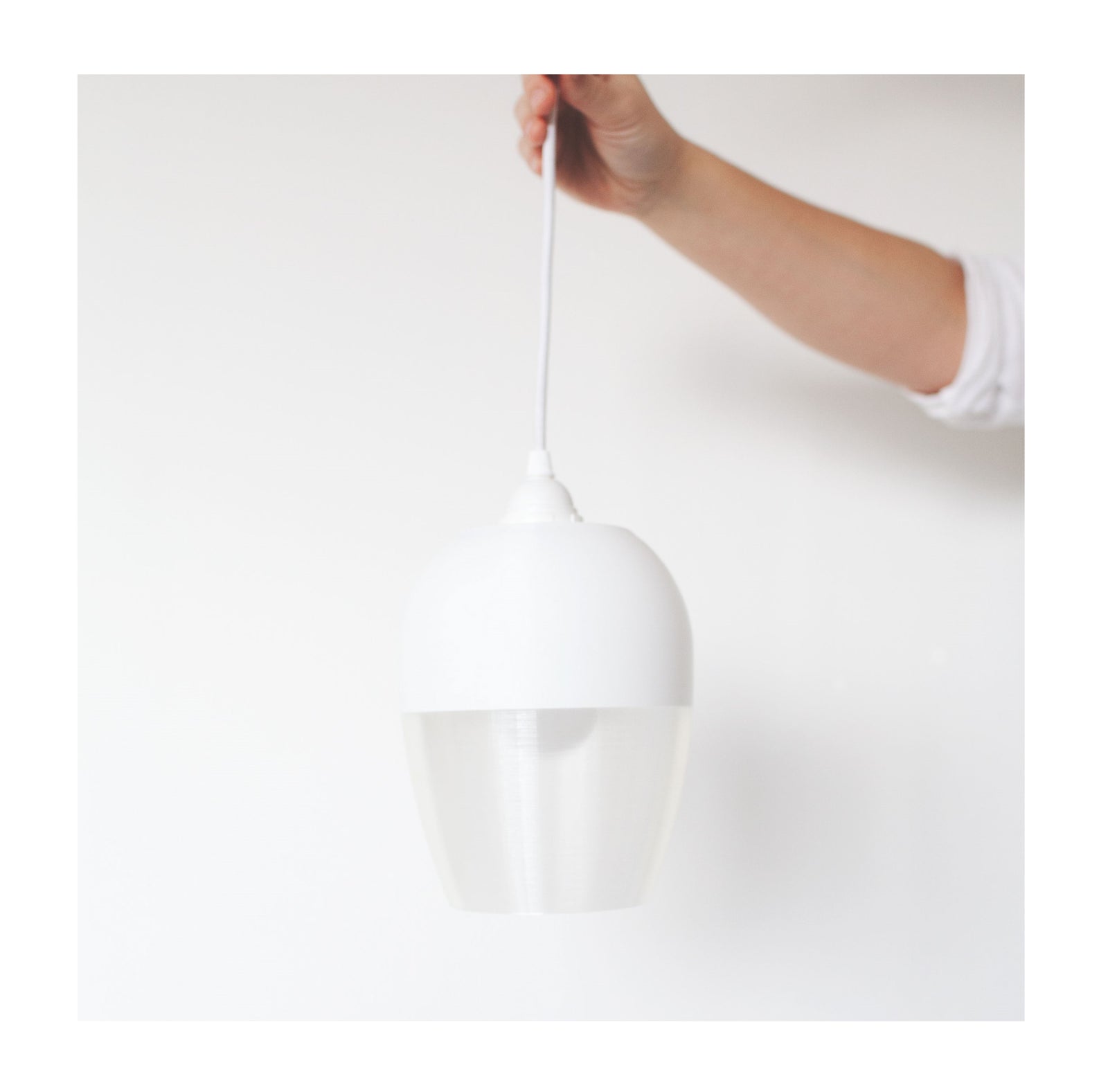 A simple and modern pendant lamp that will light up your space. The 3D-printed shade consists of two parts contributing to an unique look. The lower part is transparent and therefore provides a surprising light distribution.